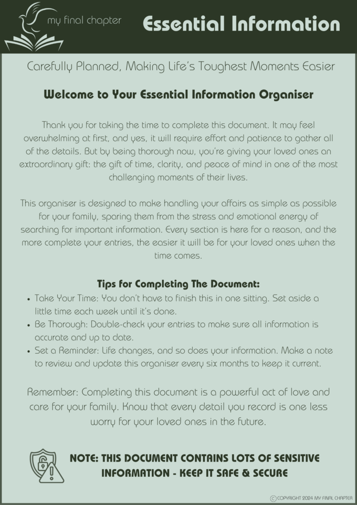 Planning for your final chapter doesn’t have to be complicated. Our templates and resources make it simple to outline your wishes, plan your life celebration, manage your digital legacy, and even dream big with your bucket list. Get started today and give your family the gift of clarity and peace of mind.